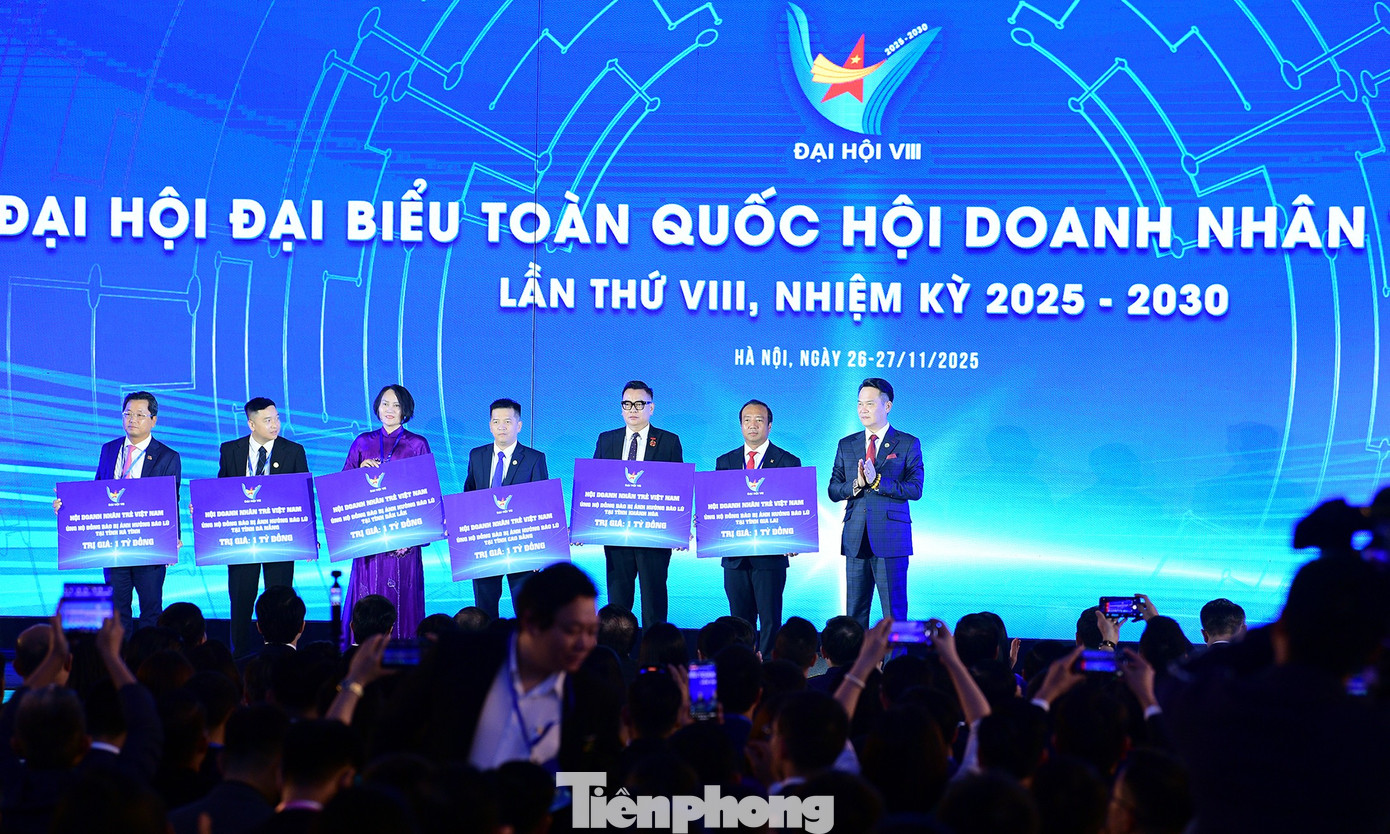 Hội Doanh nhân trẻ Việt Nam công bố và trao hỗ trợ khẩn cấp 6 tỉ đồng cho 6 tỉnh thành bị ảnh hưởng nặng nề bởi lũ lụt. Ảnh: Xuân Tùng
