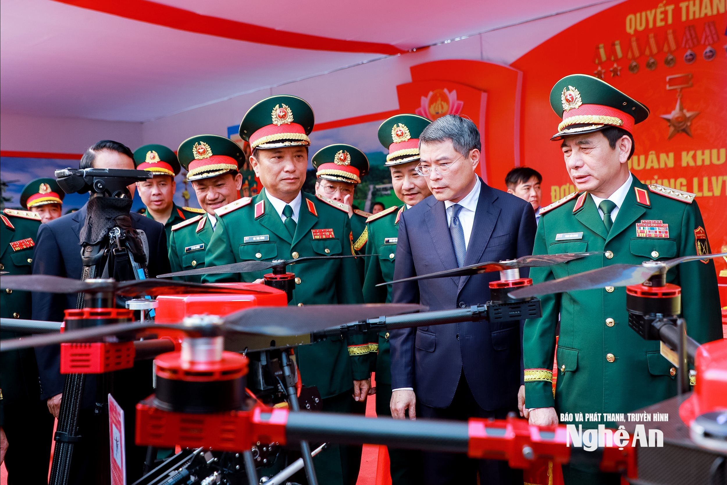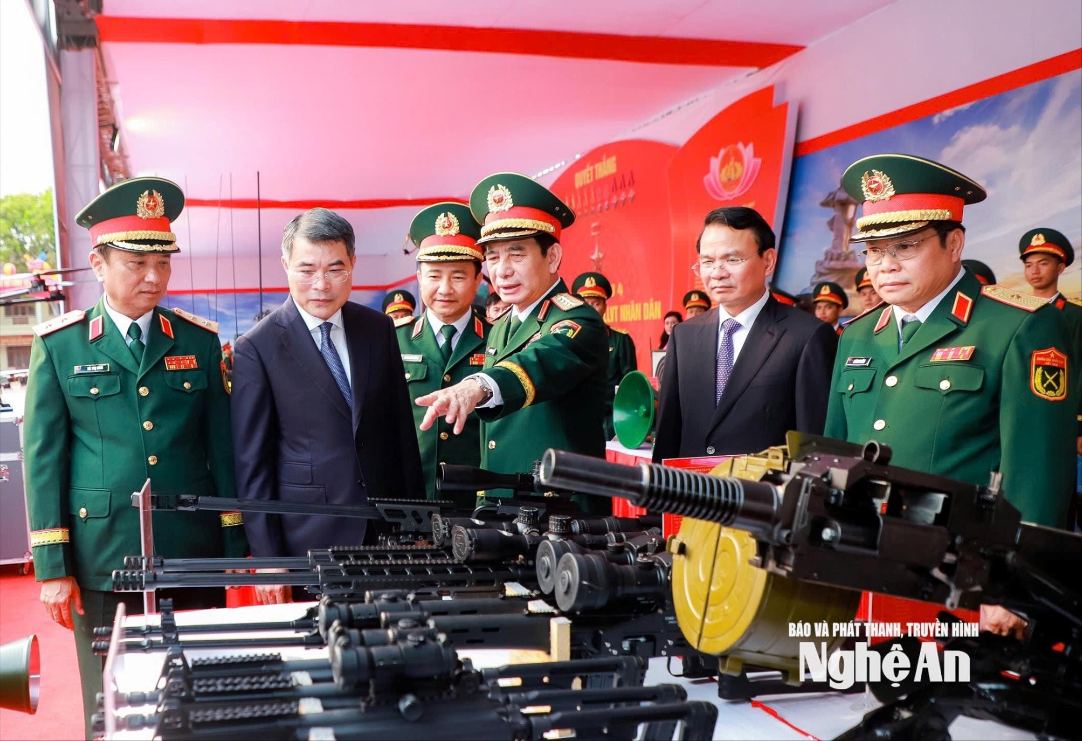 Thủ tướng Lê Minh Hưng và đoàn đại biểu tham quan các khí tài quân sự trưng bày bên lề sự kiện. Ảnh: Thành Duy