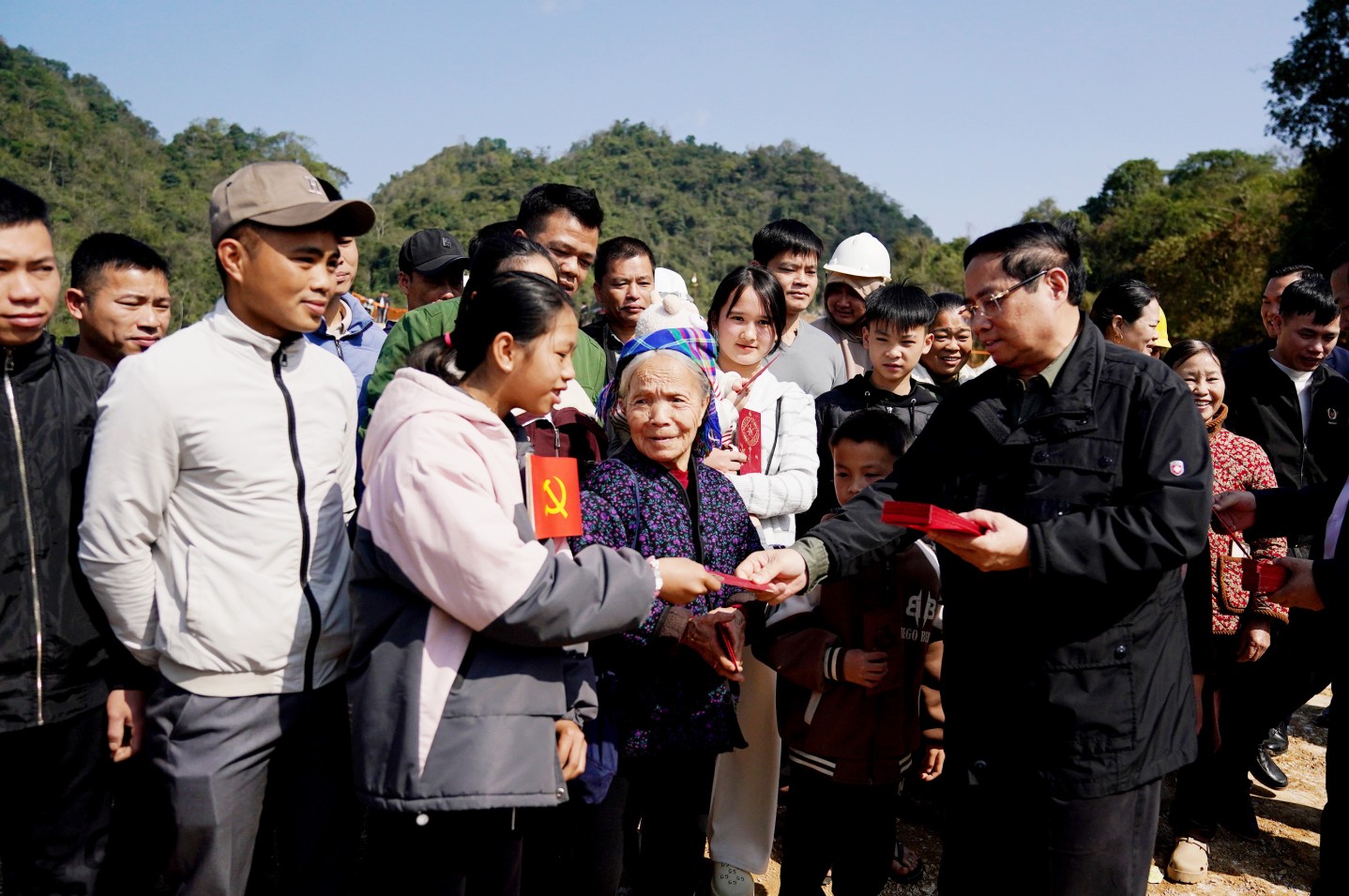 Thủ tướng Chính phủ Phạm Minh Chính và lãnh đạo các bộ, ngành trung ương, lãnh đạo tỉnh Lạng Sơn, Cao Bằng tặng quà kỹ sư, công nhân thi công dự án cao tốc Đồng Đăng - Trà Lĩnh