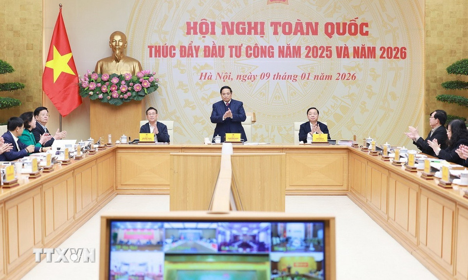 Thủ tướng Phạm Minh Chính chủ trì Hội nghị trực tuyến toàn quốc thúc đẩy đầu tư công năm 2025 và năm 2026. (Ảnh: Dương Giang/TTXVN)