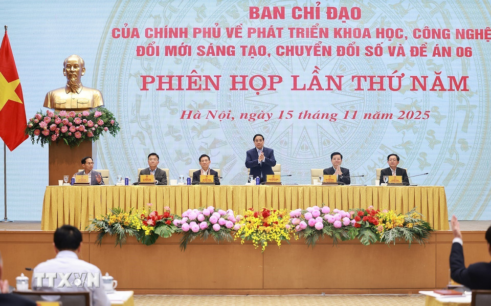 Thủ tướng Phạm Minh Chính chủ trì phiên họp lần thứ năm của BCĐ của Chính phủ về phát triển khoa học, công nghệ, đổi mới sáng tạo, chuyển đổi số và Đề án 06. (Ảnh: Dương Giang/TTXVN)