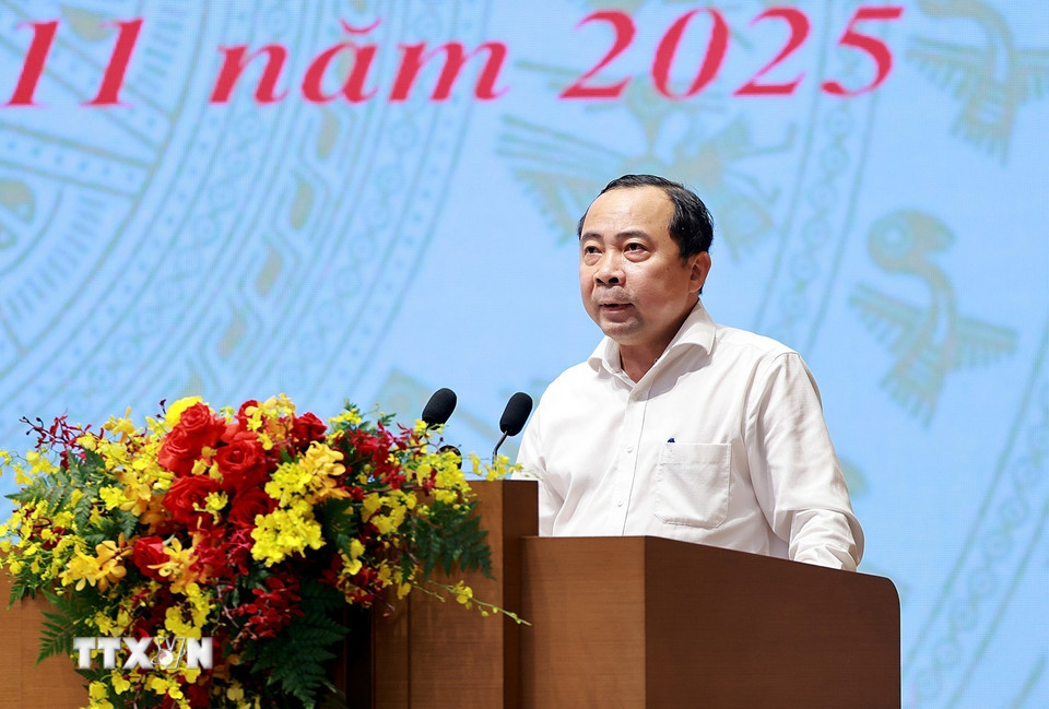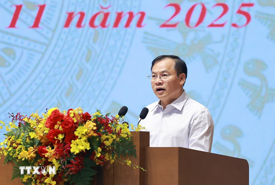 Thứ trưởng Thường trực Bộ Khoa học và Công nghệ Vũ Hải Quân báo cáo kết quả thực hiện các nhiệm vụ phát triển khoa học, công nghệ, đổi mới sáng tạo và chuyển đổi số quốc gia và các nhiệm vụ trọng tâm đến hết năm 2025. (Ảnh: Dương Giang/TTXVN)