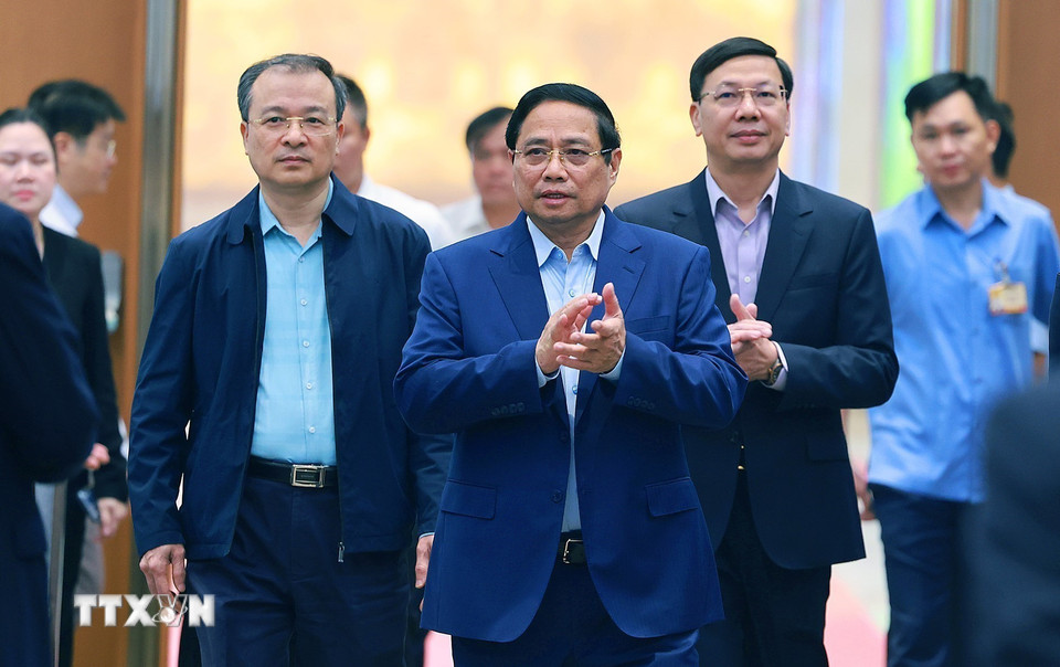 Thủ tướng Phạm Minh Chính đến phiên họp lần thứ năm của BCĐ của Chính phủ về phát triển khoa học, công nghệ, đổi mới sáng tạo, chuyển đổi số và Đề án 06. (Ảnh: Dương Giang/TTXVN)