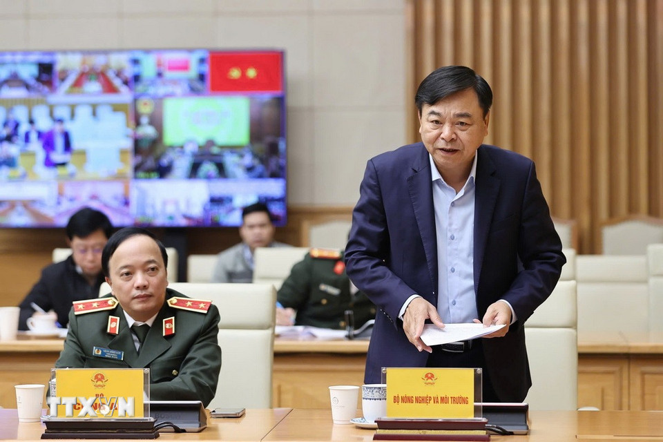 Thứ trưởng Bộ Nông nghiệp và Môi trường Nguyễn Hoàng Hiệp báo cáo tiến độ xây dựng, sửa chữa nhà ở cho các gia đình có nhà bị thiệt hại do bão, lũ tại khu vực miền Trung. (Ảnh: Dương Giang/TTXVN)