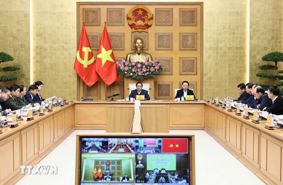 Thủ tướng Phạm Minh Chính chủ trì cuộc họp về xây dựng nhà cho nhân dân bị thiệt hại do bão lũ. (Ảnh: Dương Giang/TTXVN)