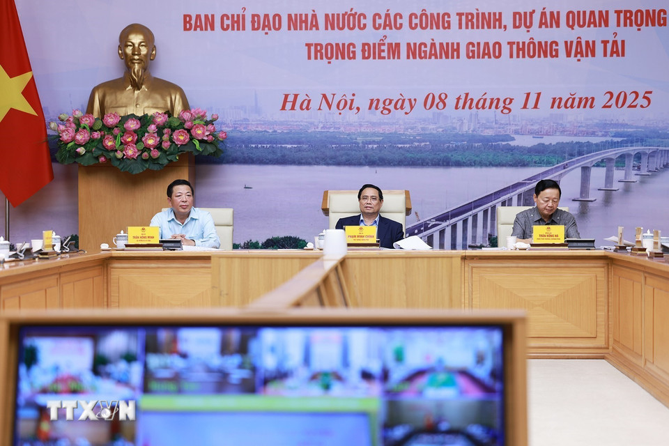 Thủ tướng Phạm Minh Chính chủ trì Phiên họp lần thứ 21 của Ban Chỉ đạo các dự án quan trọng quốc gia, trọng điểm ngành Giao thông Vận tải. (Ảnh: Dương Giang/TTXVN)