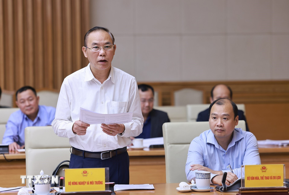Thứ trưởng Bộ Nông nghiệp và Môi trường Phùng Đức Tiến báo cáo kết quả phòng, chống khai thác hải sản bất hợp pháp. (Ảnh: Dương Giang/TTXVN)