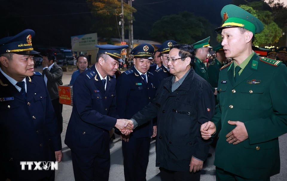 Thủ tướng Phạm Minh Chính đến thăm, chúc Tết các lực lượng làm nhiệm vụ tại cửa khẩu Tân Thanh (Lạng Sơn). (Ảnh: Dương Giang/TTXVN)