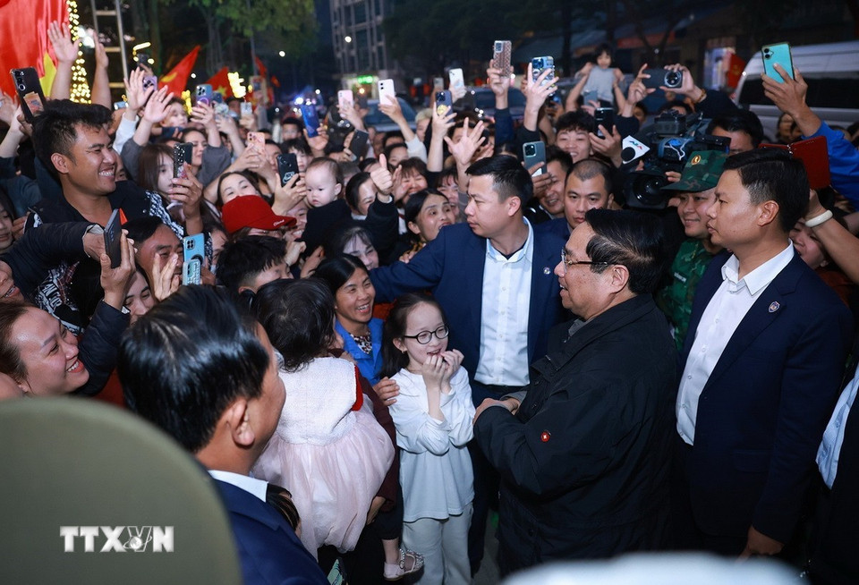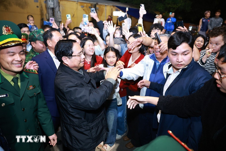 Thủ tướng Phạm Minh Chính với nhân dân khu vực cửa khẩu Tân Thanh (Lạng Sơn). (Ảnh: Dương Giang/TTXVN)
