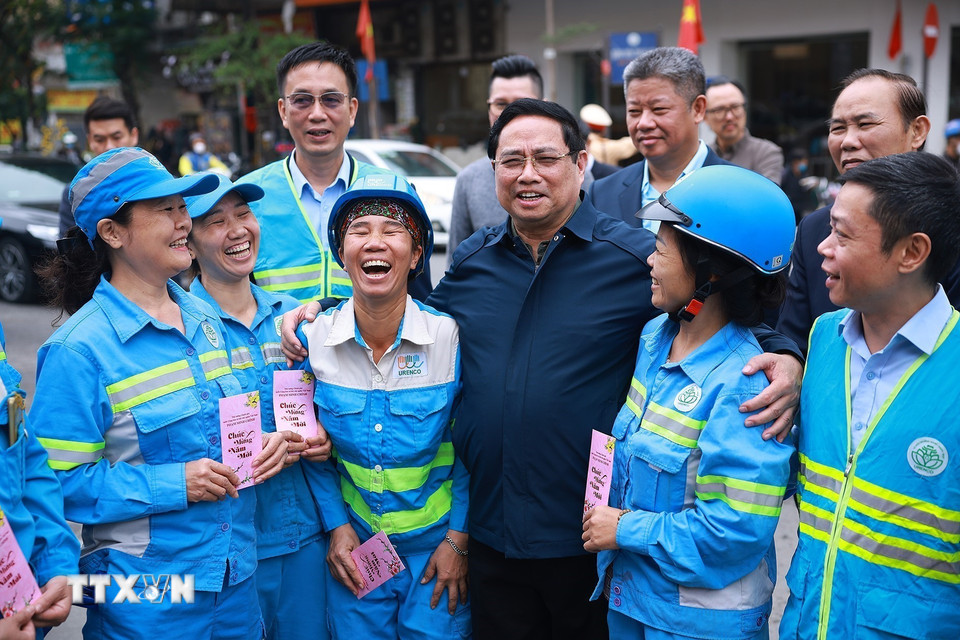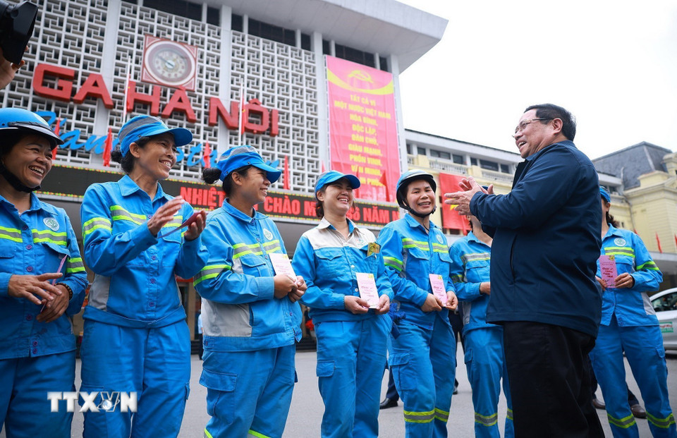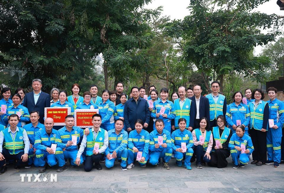 Thủ tướng Phạm Minh Chính thăm, chúc Tết và giao nhiệm vụ cho công nhân vệ sinh môi trường tại Hà Nội. (Ảnh: Dương Giang/TTXVN)