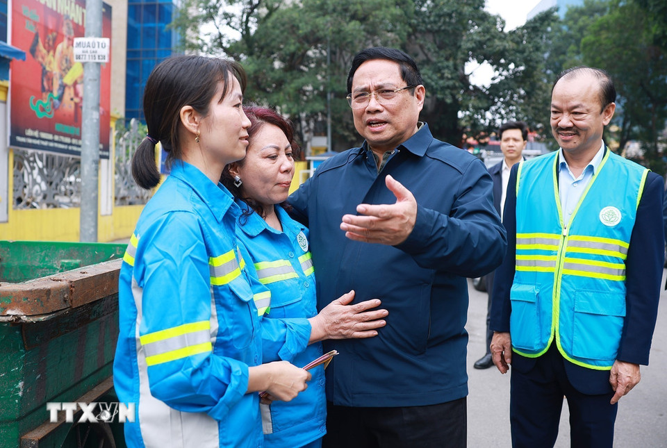 Thủ tướng Phạm Minh Chính thăm, chúc Tết công nhân đang thu gom, vận chuyển, xử lý rác thải khu vực đường Trần Nhân Tông-Hà Nội. (Ảnh: Dương Giang/TTXVN)