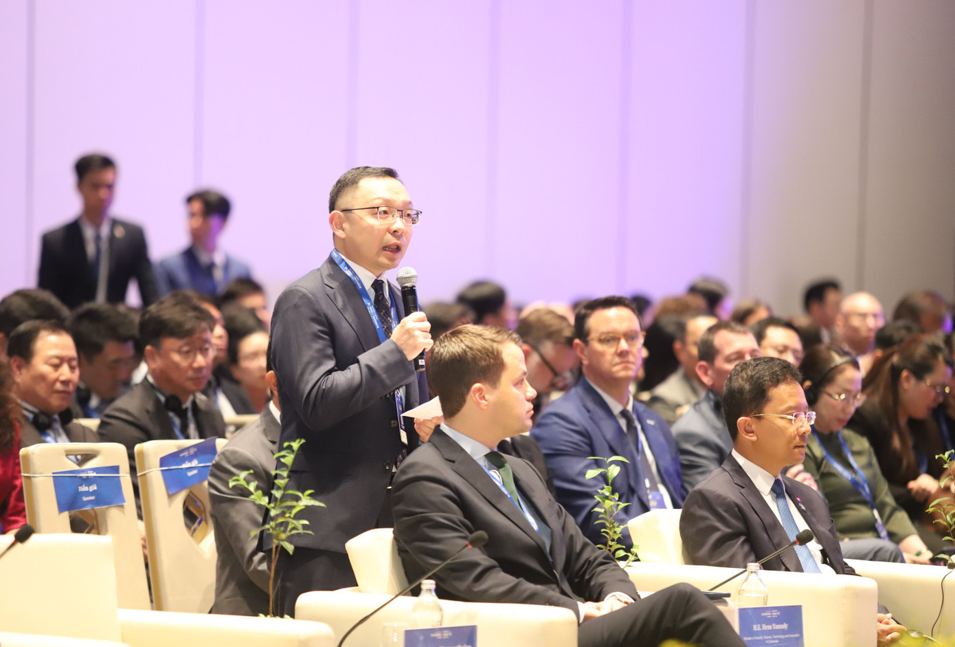 Đại diện lãnh đạo các tập đoàn, công ty trong và ngoài nước trao đổi, đề xuất với lãnh đạo Chính phủ và TPHCM. Ảnh: Ngô Tùng.