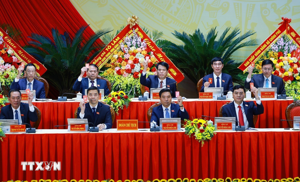Đoàn Chủ tịch biểu quyết thông qua báo cáo thẩm tra tư cách đại biểu dự Đại hội đại biểu Đảng bộ tỉnh Thanh Hóa lần thứ 20, nhiệm kỳ 2025-2030. (Ảnh: Dương Giang/TTXVN)