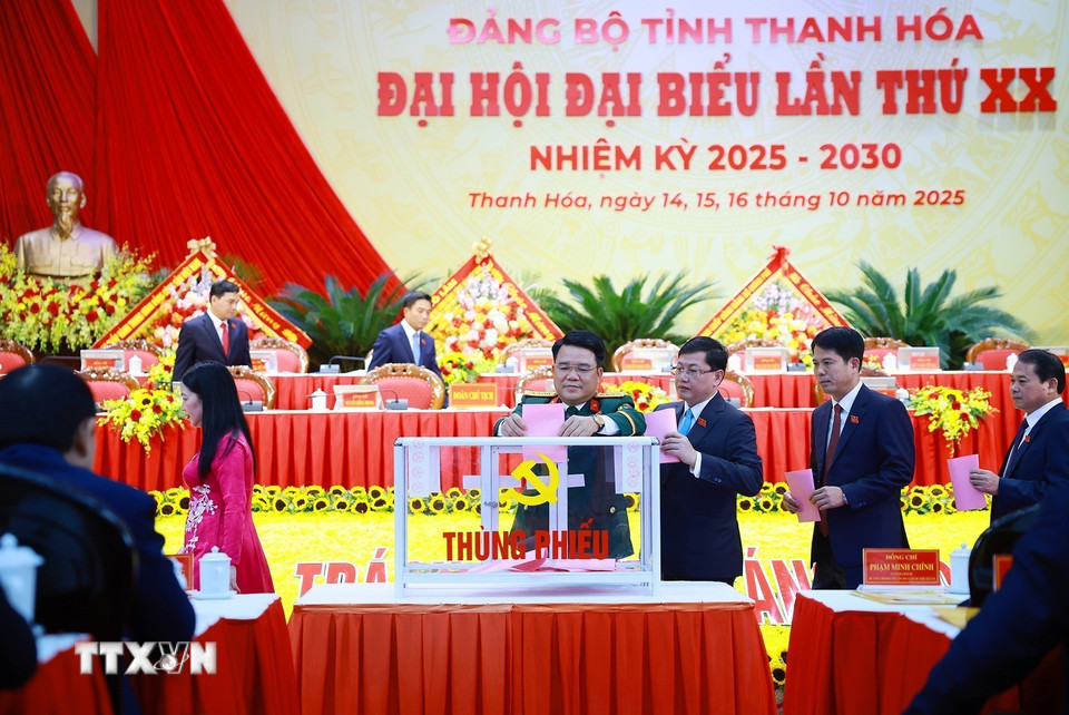 Các đại biểu bỏ phiếu bầu Ban Chấp hành Đảng bộ tỉnh Thanh Hóa nhiệm kỳ 2025-2030. (Ảnh: Dương Giang/TTXVN)