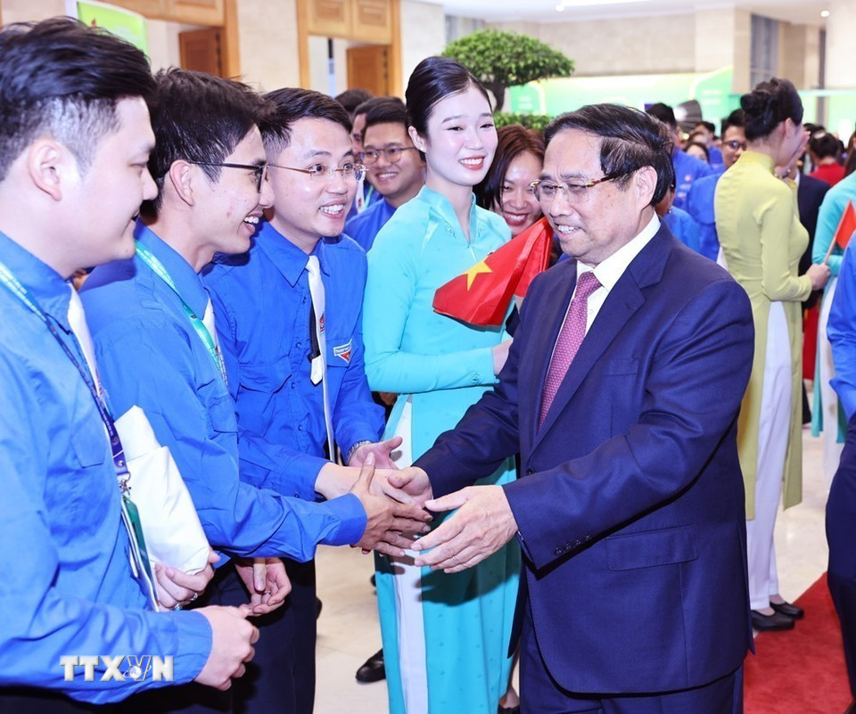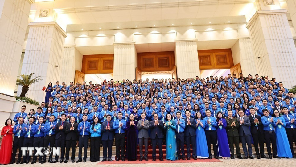 Thủ tướng Phạm Minh Chính cùng các đại biểu dự Đại hội đại biểu Đoàn Thanh niên Cộng sản Hồ Chí Minh Chính phủ lần thứ nhất, nhiệm kỳ 2025-2030. (Ảnh: Minh Đức/TTXVN)