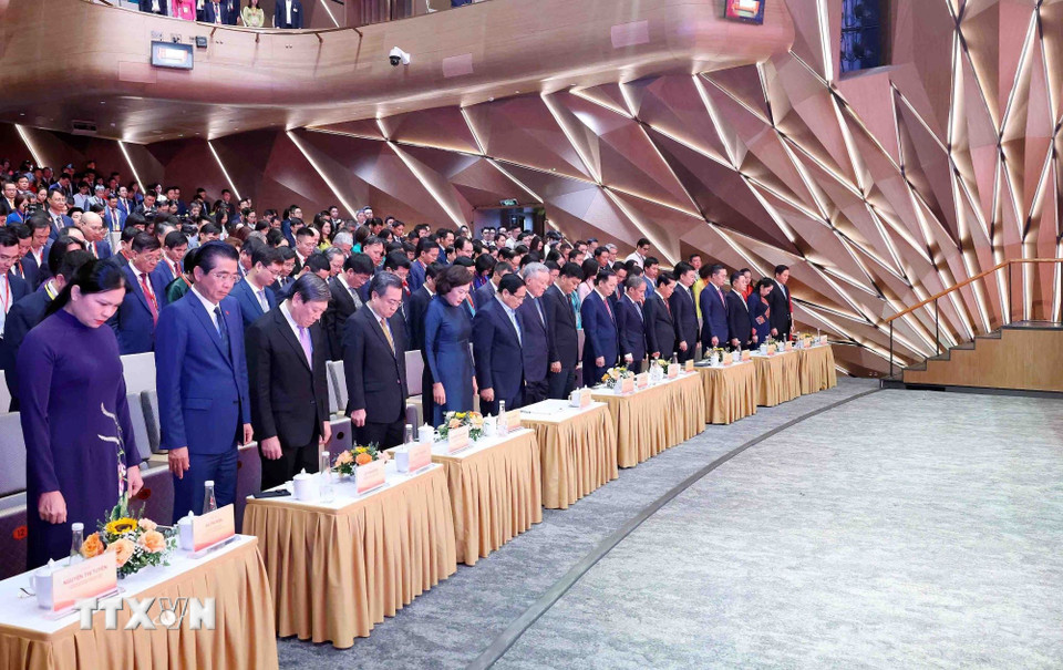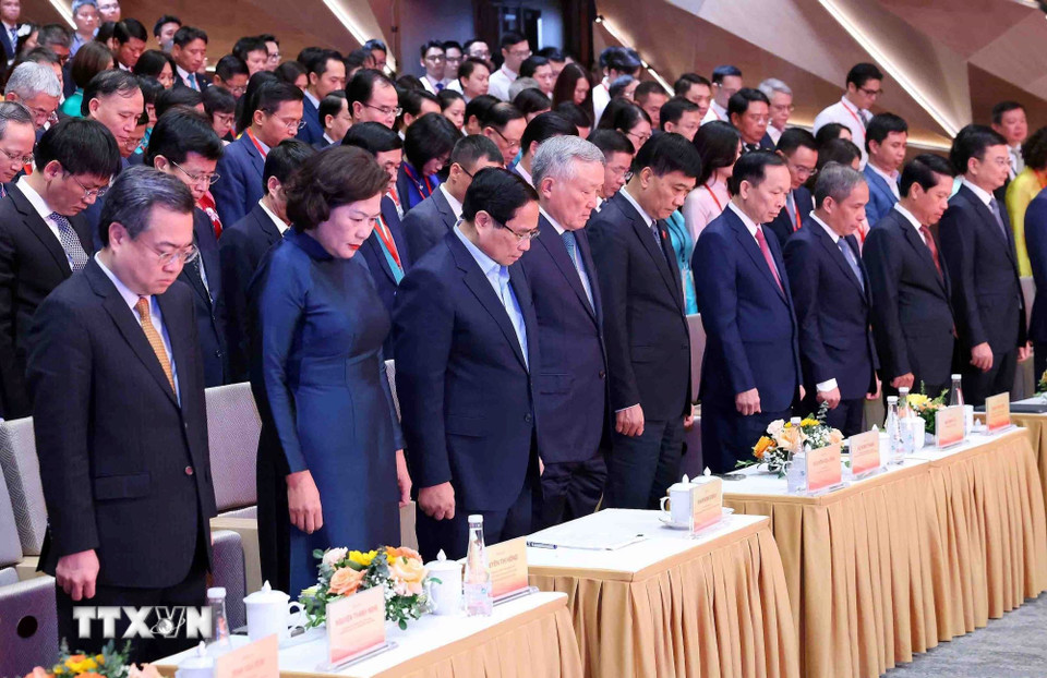 Thủ tướng Phạm Minh Chính và các đại biểu dành phút tưởng niệm những nạn nhân thiệt mạng do bão lũ. (Ảnh: Phạm Kiên/TTXVN)