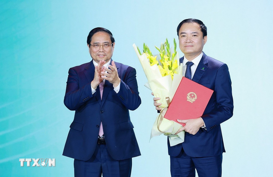 Thủ tướng Phạm Minh Chính trao Quyết định bổ nhiệm ông Lê Ngọc Sơn, Tổng Giám đốc Tập đoàn Công nghiệp-Năng lượng Quốc gia Việt Nam giữ chức Chủ tịch Hội đồng thành viên của Tập đoàn. (Ảnh: Dương Giang/TTXVN)