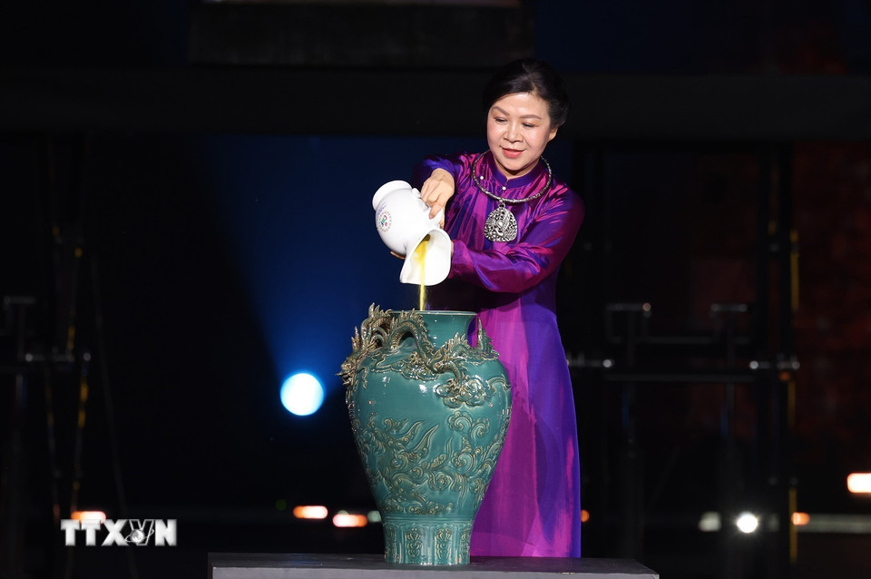 Bà Ngô Phương Ly, Phu nhân Tổng Bí thư Tô Lâm thực hiện nghi thức vẽ tranh gốm ngũ sắc. (Ảnh: Dương Giang/TTXVN)