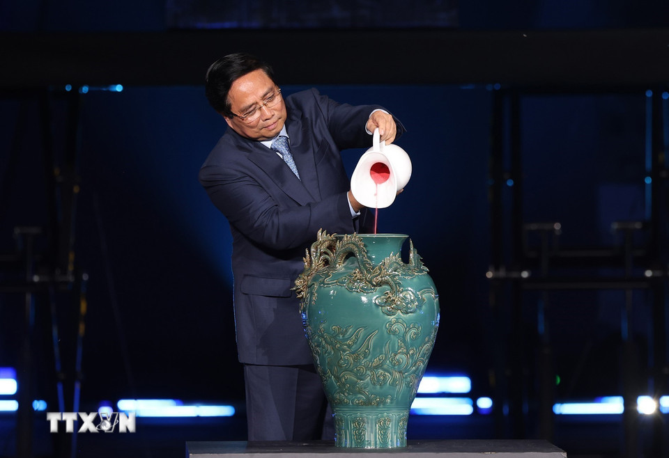 Thủ tướng Phạm Minh Chính và các lãnh đạo thực hiện nghi thức vẽ tranh gốm ngũ sắc. (Ảnh: Dương Giang/TTXVN)