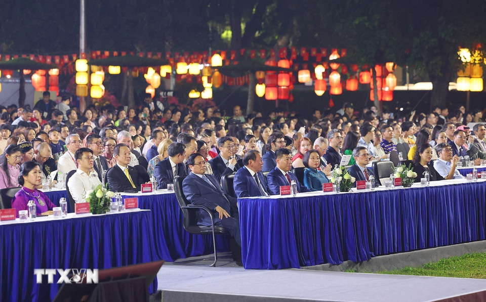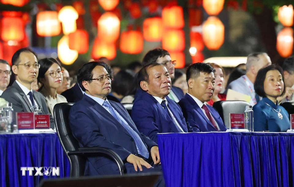 Thủ tướng Phạm Minh Chính và các đại biểu dự khai mạc Lễ hội Văn hóa Thế giới tại Hà Nội lần thứ nhất. (Ảnh: Dương Giang/TTXVN)