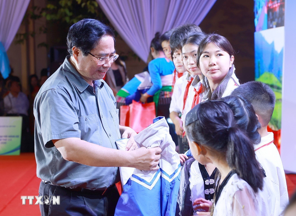 Thủ tướng Phạm Minh Chính tặng áo ấm cho học sinh xã Bát Mọt. (Ảnh: Dương Giang/TTXVN)
