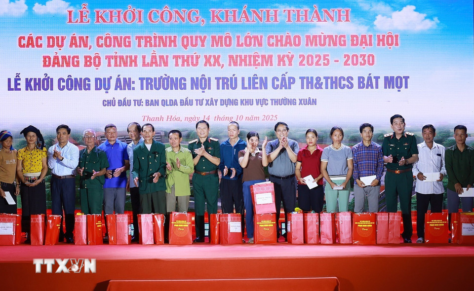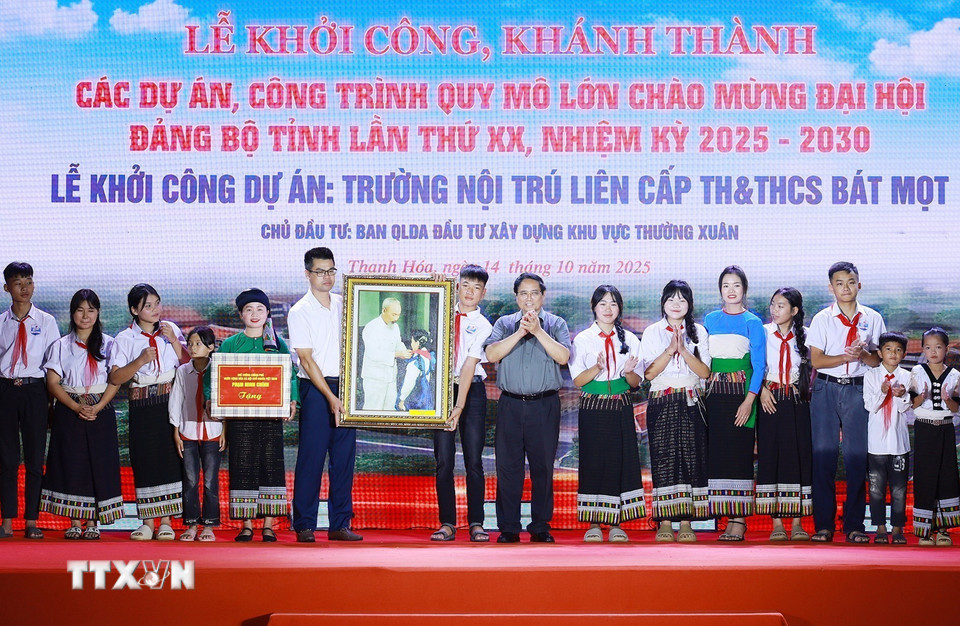 Thủ tướng Phạm Minh Chính và các đại biểu khởi công Dự án Trường nội trú liên cấp Tiểu học và Trung học cơ sở Bát Mọt tại điểm cầu xã Bát Mọt. (Ảnh: Dương Giang/TTXVN)