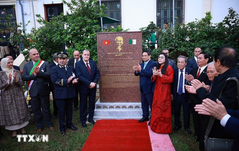 Thủ tướng Phạm Minh Chính và Phu nhân cùng lãnh đạo Algeria tại Lễ khánh thành Bia tưởng niệm Chủ tịch Hồ Chí Minh ở thủ đô Algiers. (Ảnh: Dương Giang/TTXVN)