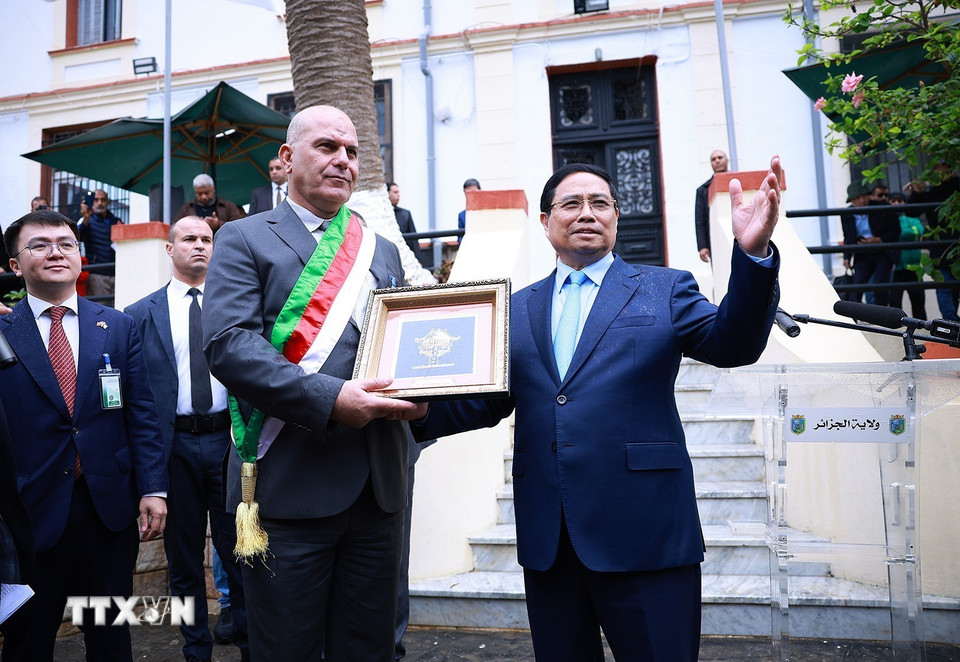 Thủ tướng Phạm Minh Chính tặng quà cho chính quyền địa phương, nơi đặt bia tưởng niệm về thân thế, sự nghiệp Chủ tịch Hồ Chí Minh ở Algeria. (Ảnh: Dương Giang/TTXVN)