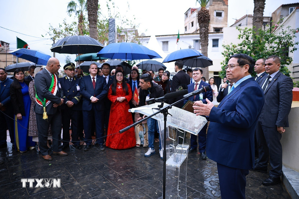 Thủ tướng Phạm Minh Chính phát biểu tại Lễ khánh thành Bia tưởng niệm Chủ tịch Hồ Chí Minh tại thủ đô Algiers, Algeria. (Ảnh: Dương Giang/TTXVN)