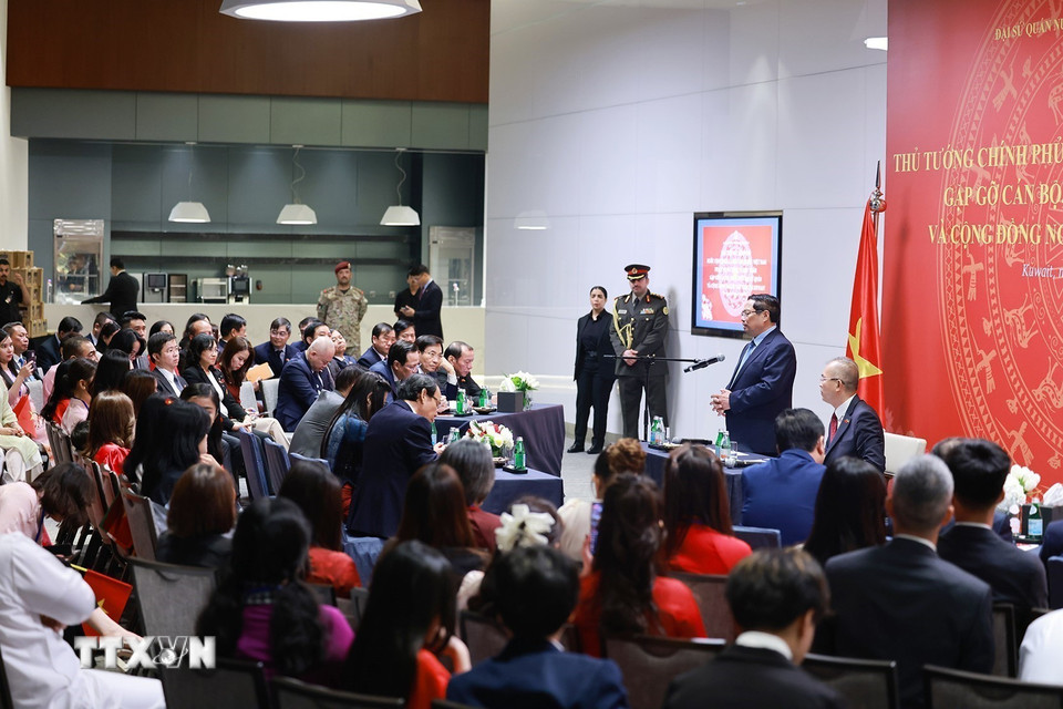 Thủ tướng Phạm Minh Chính gặp cán bộ Đại sứ quán và cộng đồng người Việt Nam tại Kuwait. (Ảnh: Dương Giang/TTXVN)