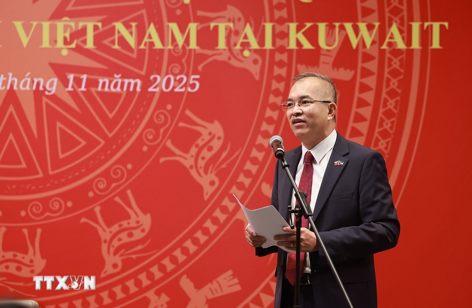 Đại sứ Việt Nam tại Kuwait Nguyễn Đức Thắng báo cáo tình hình cộng đồng người Việt Nam tại Kuwait. (Ảnh: Dương Giang/TTXVN)
