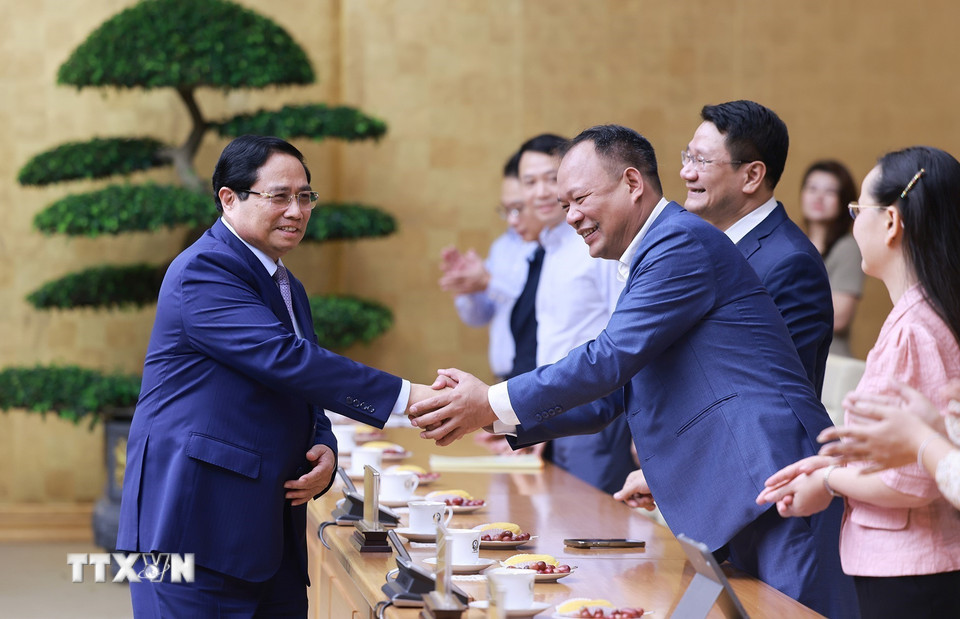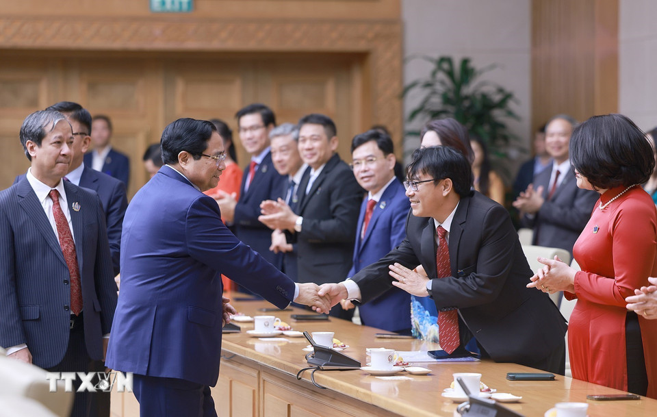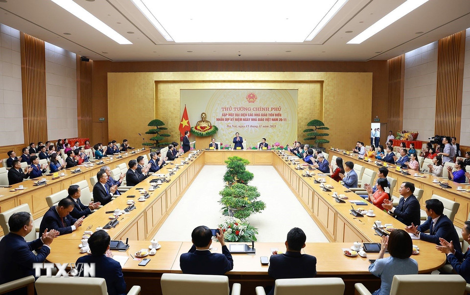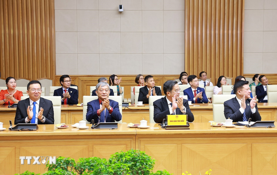 Thủ tướng Phạm Minh Chính gặp mặt đại diện các nhà giáo tiêu biểu toàn quốc. (Ảnh: Dương Giang/TTXVN)
