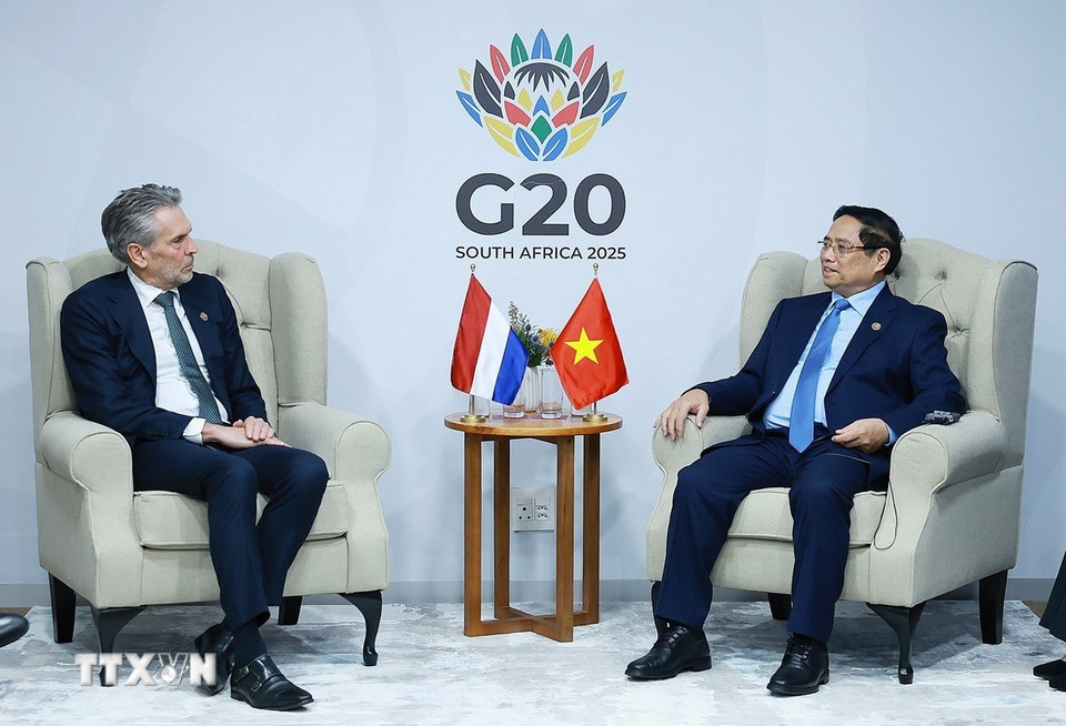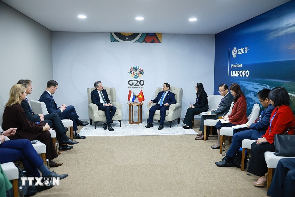Nhân chuyến tham dự Hội nghị Thượng đỉnh G20 tại Nam Phi, sáng 23/11/2025 giờ địa phương (trưa cùng ngày, giờ Hà Nội), Thủ tướng Phạm Minh Chính gặp Thủ tướng Australia Anthony Albanese. (Ảnh: TTXVN phát)