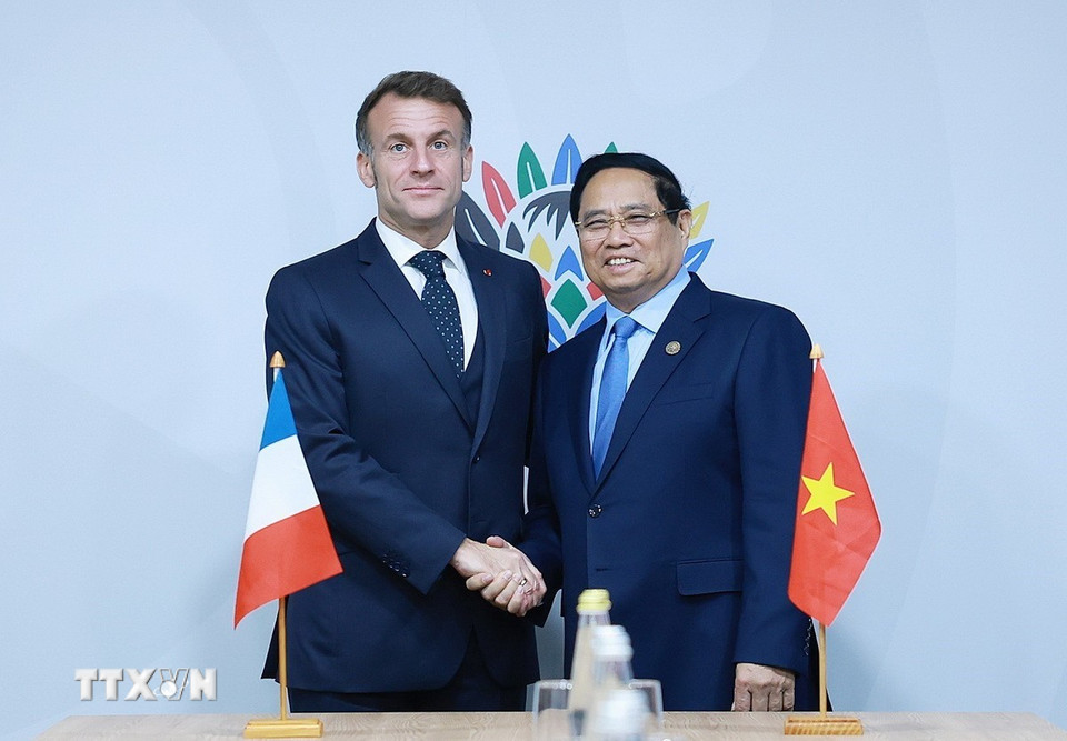 Thủ tướng Phạm Minh Chính gặp Tổng thống Pháp Emmanuel Macron. (Ảnh: Dương Giang/TTXVN)