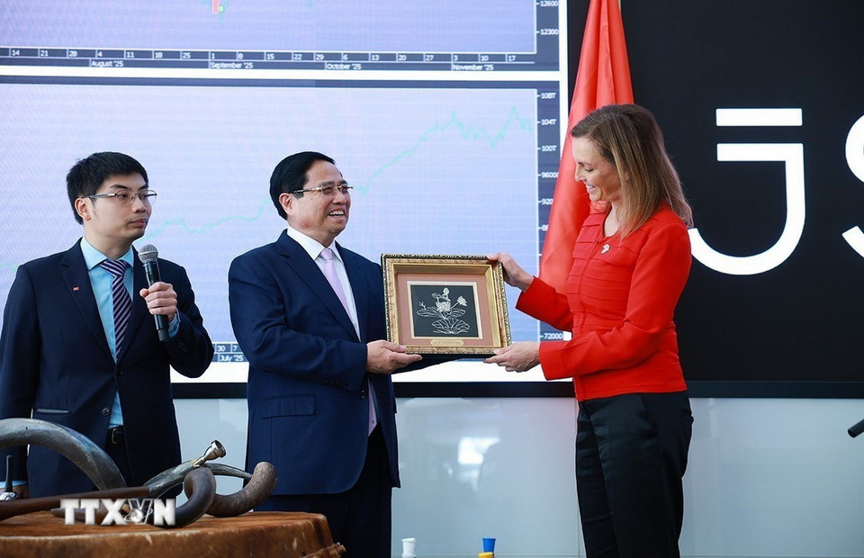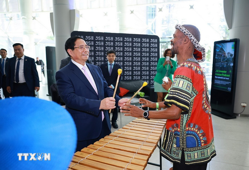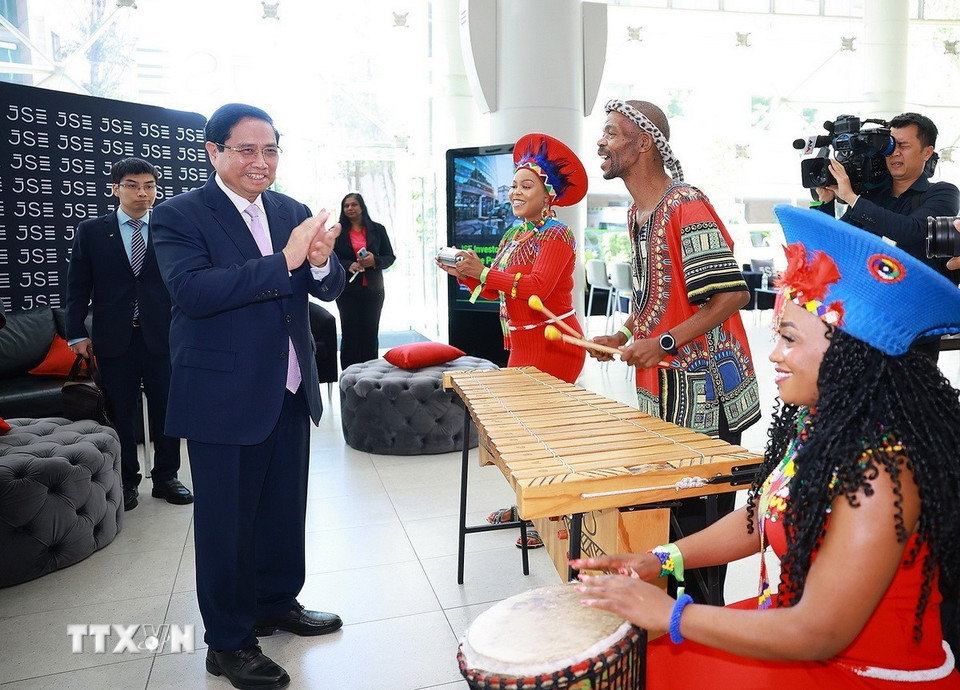 Thủ tướng Phạm Minh Chính thăm và khai trương phiên giao dịch tại Thị trường Chứng khoán Johannesburg. (Ảnh: Dương Giang/TTXVN)