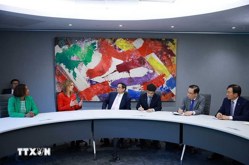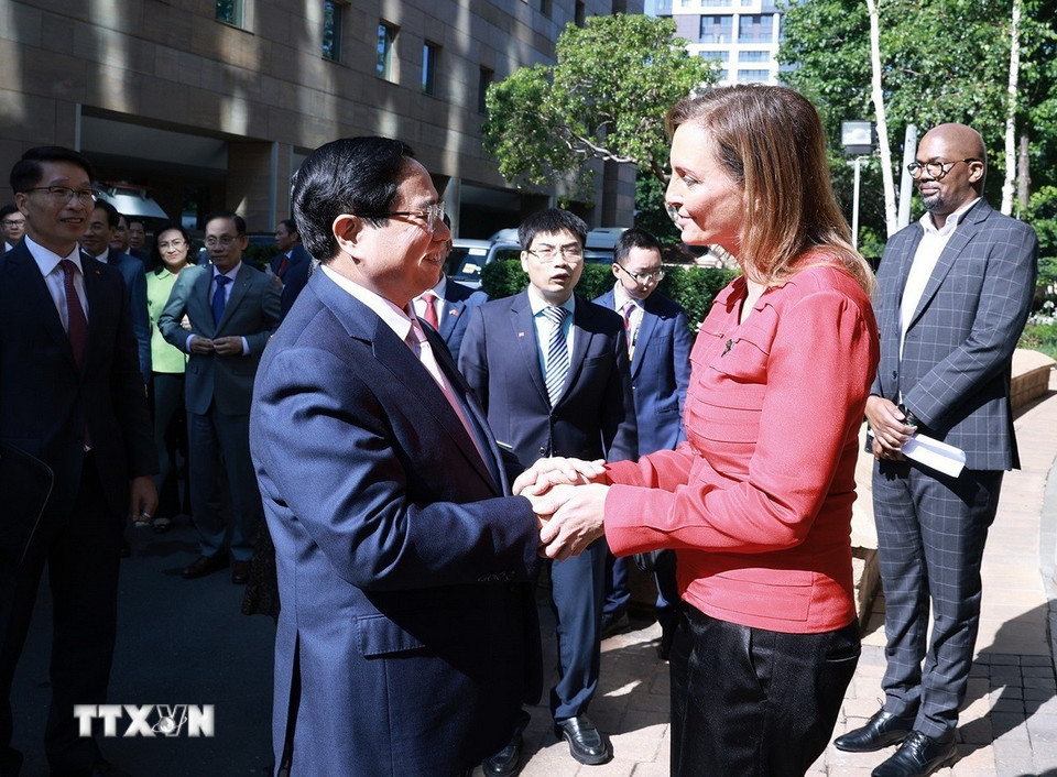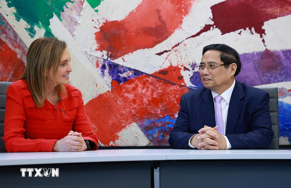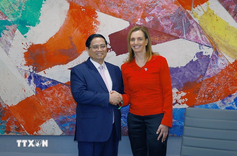 Thủ tướng Phạm Minh Chính gặp bà Leila Fourie, Giám đốc Thị trường Chứng khoán Johannesburg. (Ảnh: Dương Giang/TTXVN)