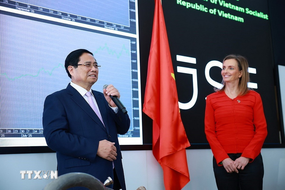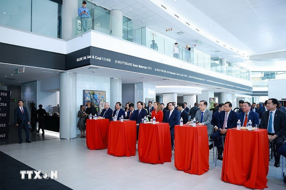 Thủ tướng Phạm Minh Chính tham dự khai trương phiên giao dịch tại Thị trường Chứng khoán Johannesburg. (Ảnh: Dương Giang/TTXVN)