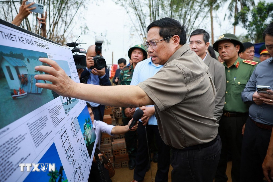 Thủ tướng Phạm Minh Chính thăm vùng ngập nước hoàn toàn tại thôn Phú Hữu, xã Hòa Thịnh và nghe báo cáo về phương án xây dựng nhà tránh lũ cho bà con, nhân dân vùng lũ. (Ảnh: Dương Giang/TTXVN)
