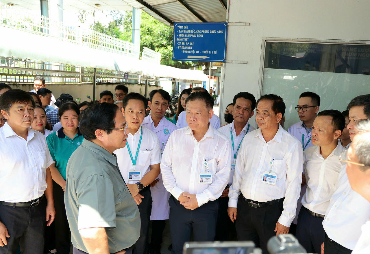 Thủ tướng Chính phủ kiểm tra hiện trạng cơ sở và thăm hỏi động viên đội ngũ lãnh đạo, cán bộ Bệnh viện Ung bướu Cần Thơ về những khó khăn hiện tại. (ảnh MT)
