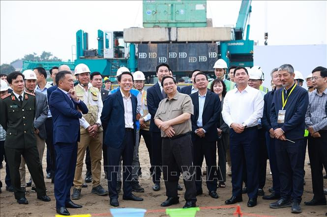 Thủ tướng Phạm Minh Chính kiểm tra dự án đầu tư xây dựng đường Vành đai 4 Vùng Thủ đô Hà Nội (đoạn qua địa phận tỉnh Bắc Ninh). Ảnh: Dương Giang/TTXVN