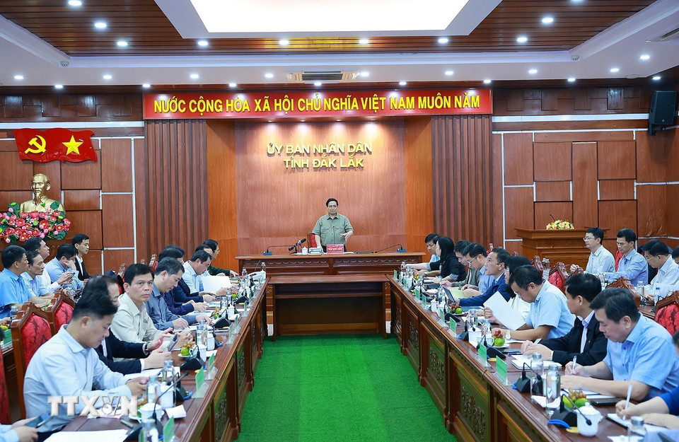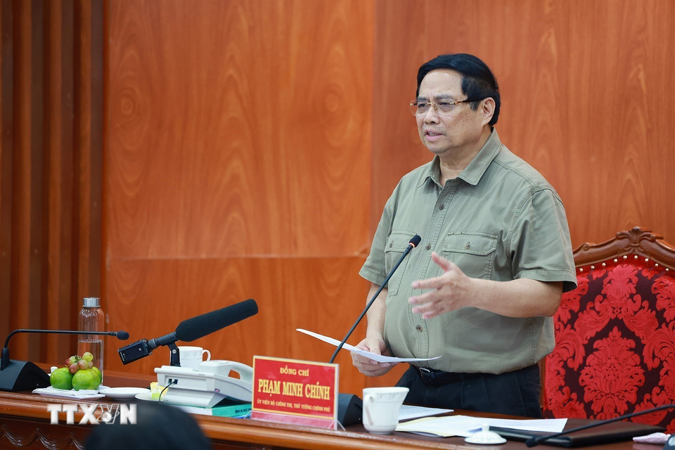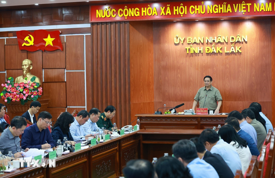 Thủ tướng Phạm Minh Chính làm việc với lãnh đạo các tỉnh: Đắk Lắk, Gia Lai, Khánh Hòa, Lâm Đồng để triển khai các biện pháp khắc phục hậu quả mưa lũ, ổn định đời sống nhân dân. (Ảnh: Dương Giang/TTXVN)