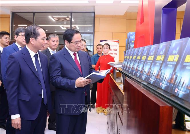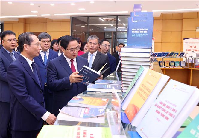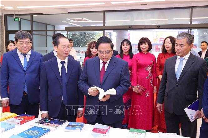 Thủ tướng Phạm Minh Chính và các đại biểu tham quan khu trưng bày sách và giới thiệu về các hoạt động của Học viện. Ảnh: Văn Điệp/TTXVN