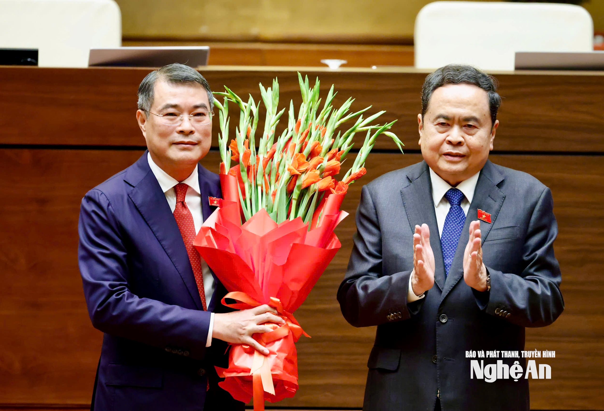Chủ tịch Quốc hội Trần Thanh Mẫn thay mặt lãnh đạo Đảng, Nhà nước và các vị đại biểu Quốc hội tặng hoa chúc mừng Thủ tướng Chính phủ Lê Minh Hưng. Ảnh: Viết Chung