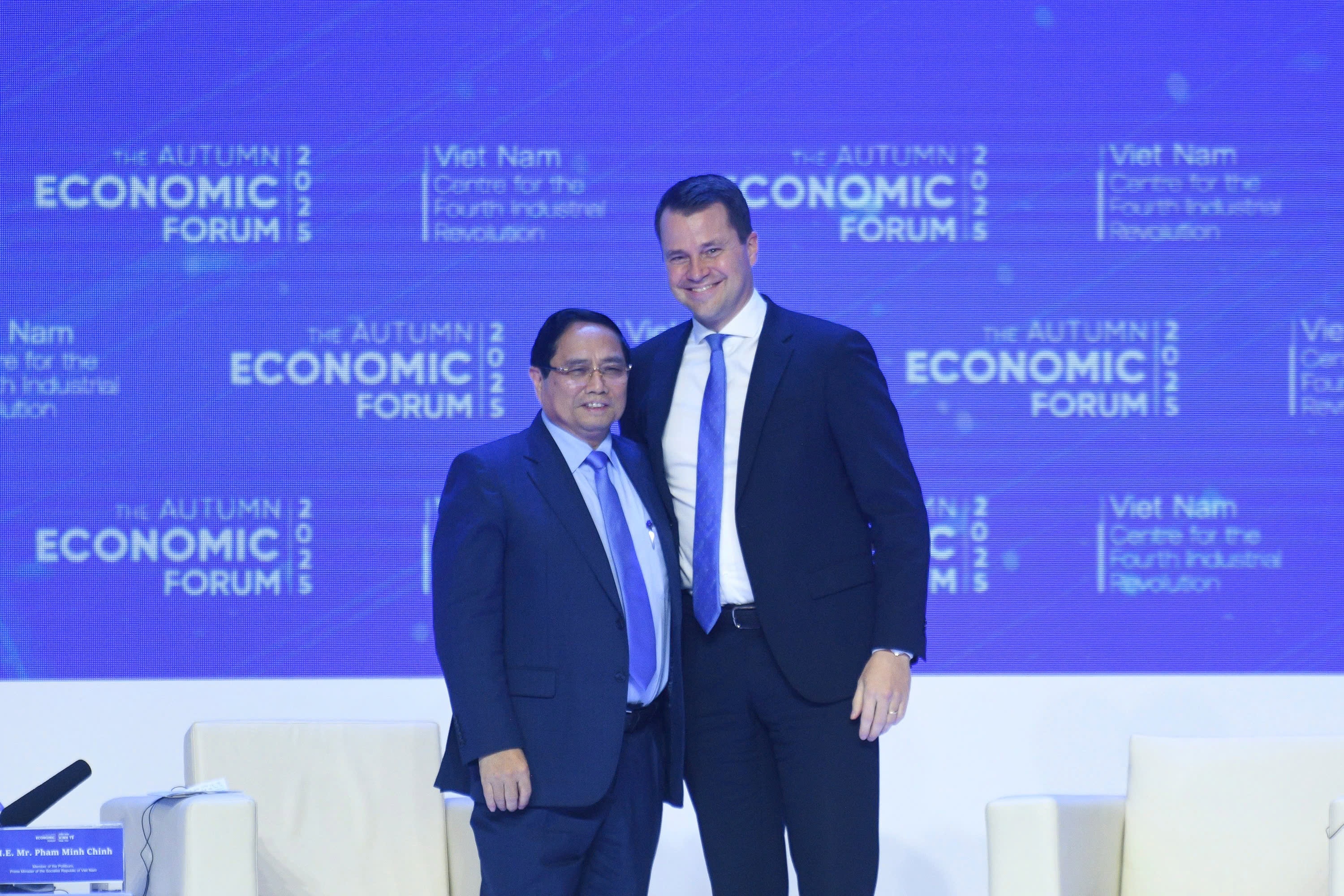 Thủ tướng Phạm Minh Chính và Giám đốc điều hành WEF Stephan Mergenthaler. Ảnh: Duy Hiệu.