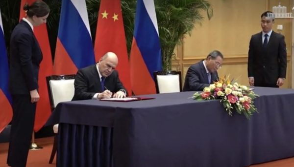 Thủ tướng Nga Mikhail Mishustin và Thủ tướng Trung Quốc Lý Cường ký thông cáo chung, bày tỏ tin tưởng vào triển vọng quan hệ hai nước. Ảnh: Kremlin.ru