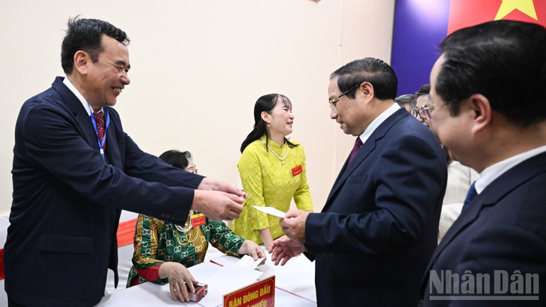 Thủ tướng Phạm Minh Chính và Phu nhân thực hiện quy trình bỏ phiếu lựa chọn những đại biểu xứng đáng. (Ảnh: TRẦN HẢI)