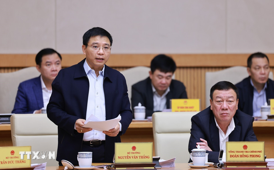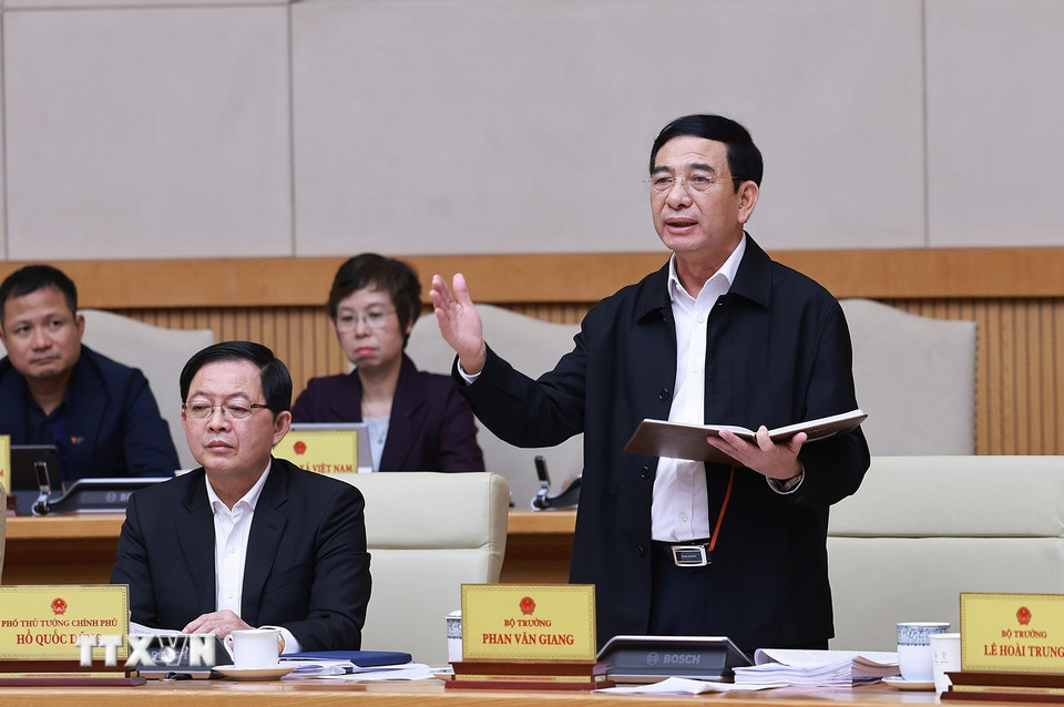 Bộ trưởng Tài chính Nguyễn Văn Thắng báo cáo tóm tắt tình hình kinh tế-xã hội tháng 10 và 10 tháng năm 2025. (Ảnh: Dương Giang/TTXVN)