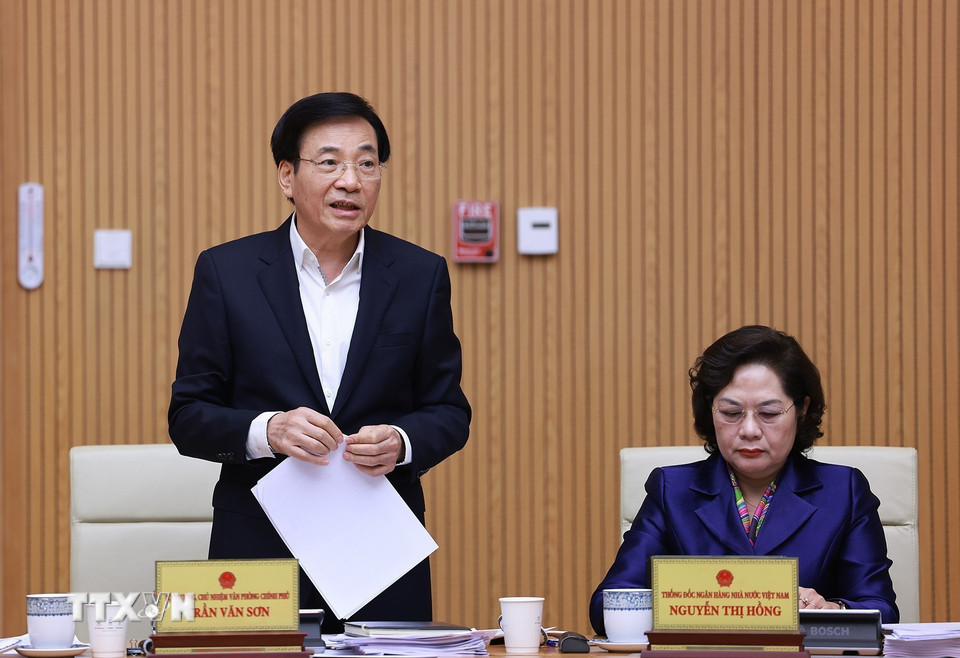 Bộ trưởng, Chủ nhiệm Văn phòng Chính phủ Trần Văn Sơn báo cáo kết quả thực hiện cải cách thủ tục hành chính. (Ảnh: Dương Giang/TTXVN)