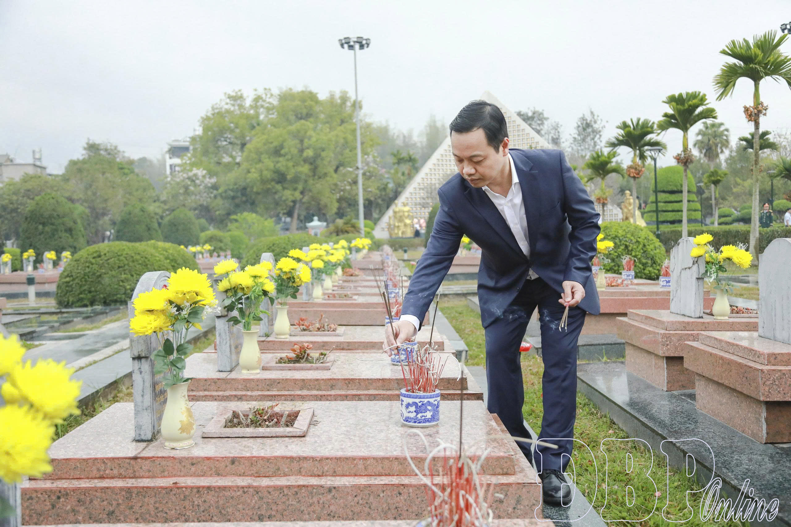 Bí thư Tỉnh ủy Trần Tiến Dũng thắp hương lên phần mộ Liệt sĩ tại Nghĩa trang Liệt sĩ Quốc gia A1. Ảnh: Trần Dũng