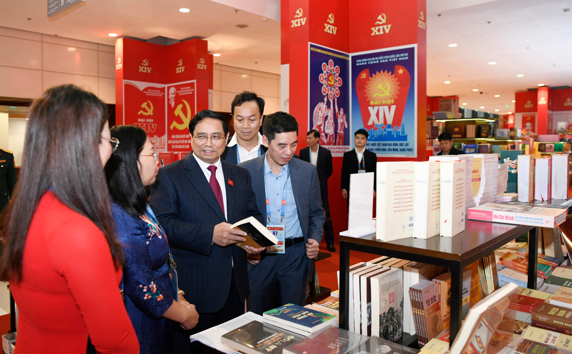 Thủ tướng Phạm Minh Chính tham quan không gian trưng bày sách báo tại Đại hội 14 của Đảng